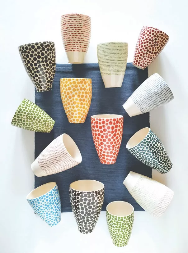 „Man labai patinka daryti įvairius dubenėlius, o ir žmonėms jie labai patinka, – šypsosi keramikė. – Viskas nuolat sukasi aplink ryškias spalvas, taškiukus, burbuliukus, kartais labai minimalų, ramų dekorą.