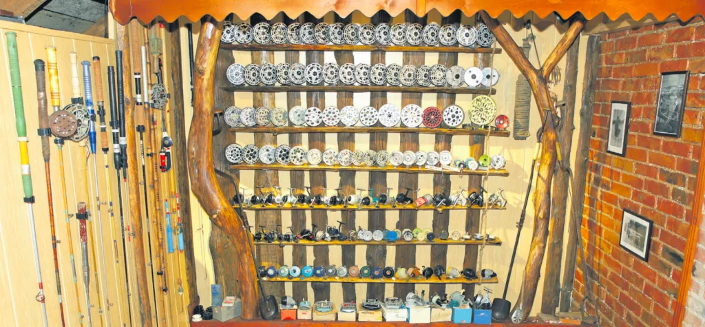 Po juo – nuotrauka, kurioje ant sienos, specialiai tam sukaltose lentynose išdėliotos senos, tarybinių laikų žvejybinės ritės. Ir ne viena, o kelios dešimtys!