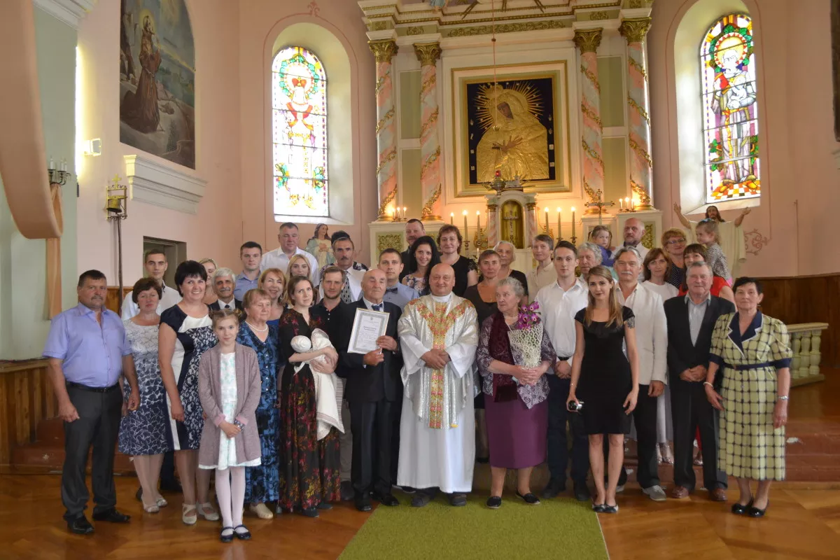 Širvintų rajono Gelvonų seniūnijos seniūnas Lionginas Juzėnas, sukaktuvininkų sūnaus bendramokslis, tarė sveikinimo žodį ir, įteikęs dovanas, pasilenkė ir pabučiavo ranką. Sutuoktinių krikšto dukra, sveikindama mylimus krikštatėvius, suklupo prieš juos ir taip pat pabučiavo rankas.
